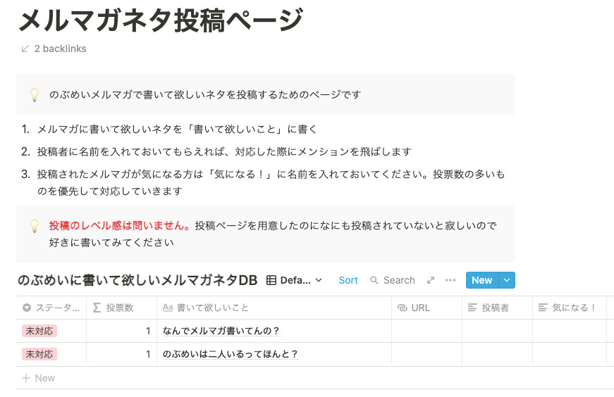 Notionではこういった事もできるということで、こちらにこのメルマガで書いて欲しいネタを募集するページを作りました。誰でも投稿できて、誰かが投票したネタに投票することができるので見てみてください。
