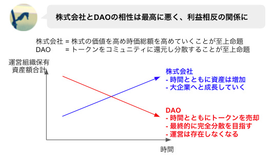 株式会社がトークンを発行しDAOを目指していた場合、DAOを目指すために自社保有資産のトークンを売却し続けることになり時価総額が下がってしまい自己矛盾に陥ってしまいます。そうなると株主への責任を果たすことが出来なくなってしまうわけですね。