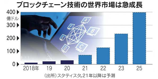 現在、ブロックチェーンの市場は2兆ドルを超える巨大なマーケットに成長しています。日経の記事の中にも成長予測としてその推移が掲載されており、2025年には4兆ドルになると推測されています。